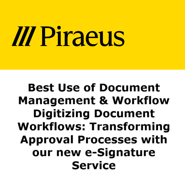 Η Τράπεζα Πειραιώς εφάρμοσε μια ολοκληρωμένη λύση ψηφιακής υπογραφής βασισμένη στην πλατφόρμα Namirial eSignAnywhere, διασυνδεδεμένη με Power Automate, TIBCO και Documentum. Η λύση εξυπηρετεί πάνω από 1,5 εκατομμύριο συναλλαγές ετησίως, καλύπτοντας 650+ τύπους εγγράφων και εξασφαλίζοντας ταχύτητα, ασφάλεια και κανονιστική συμμόρφωση. Με τη χρήση tablets και την πλήρη αυτοματοποίηση της διαδικασίας, το έργο μείωσε σημαντικά το χρόνο και το κόστος διεκπεραίωσης, ενώ αποτέλεσε καταλύτη στον λειτουργικό εκσυγχρονισμό της Τράπεζας, ενισχύοντας παράλληλα και την βιωσιμότητα συμβάλλοντας στη μείωση του περιβαλλοντικού αποτυπώματος.