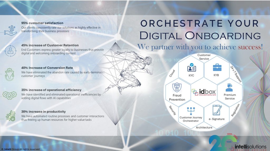 Η Intelli, μέσω της πλατφόρμας idbox™, υλοποίησε μια πλήρως ψηφιακή, end-to-end λύση εγγραφής εμπόρων για το διεθνή οργανισμό του χώρο των acquiring υπηρεσιών, ΝΕΧΙ. Η διαδικασία περιλαμβάνει αυτοματοποιημένο KYC/KYB, έλεγχο εταιρικών στοιχείων, ταυτοποίηση νομίμων εκπροσώπων, risk scoring και συμβατότητα με κανονιστικά πλαίσια (AML, eIDAS, GDPR). Με δυναμικές ροές ανά τύπο επιχείρησης και no-code παραμετροποίηση, η ενεργοποίηση ολοκληρώνεται πλέον σε λιγότερο από 30 λεπτά. Το έργο αποτελεί πρότυπο λειτουργικής ενοποίησης εμπειρίας χρήστη, συμμόρφωσης και αυτοματοποίησης, σε κλίμακα και πολυπλοκότητα διεθνούς επιπέδου.
